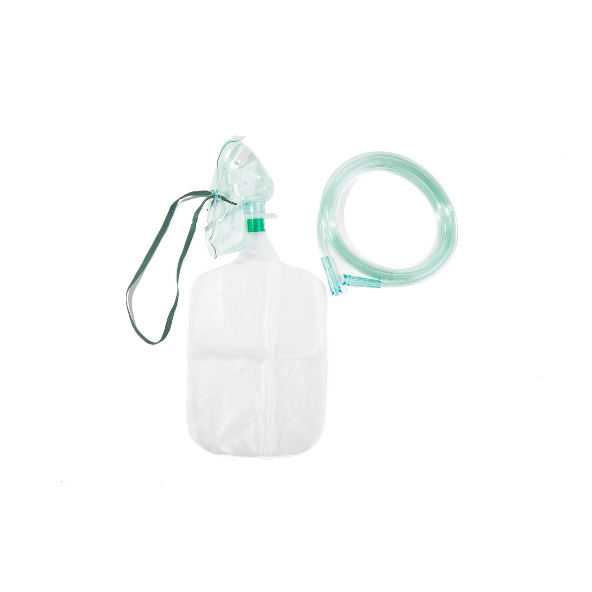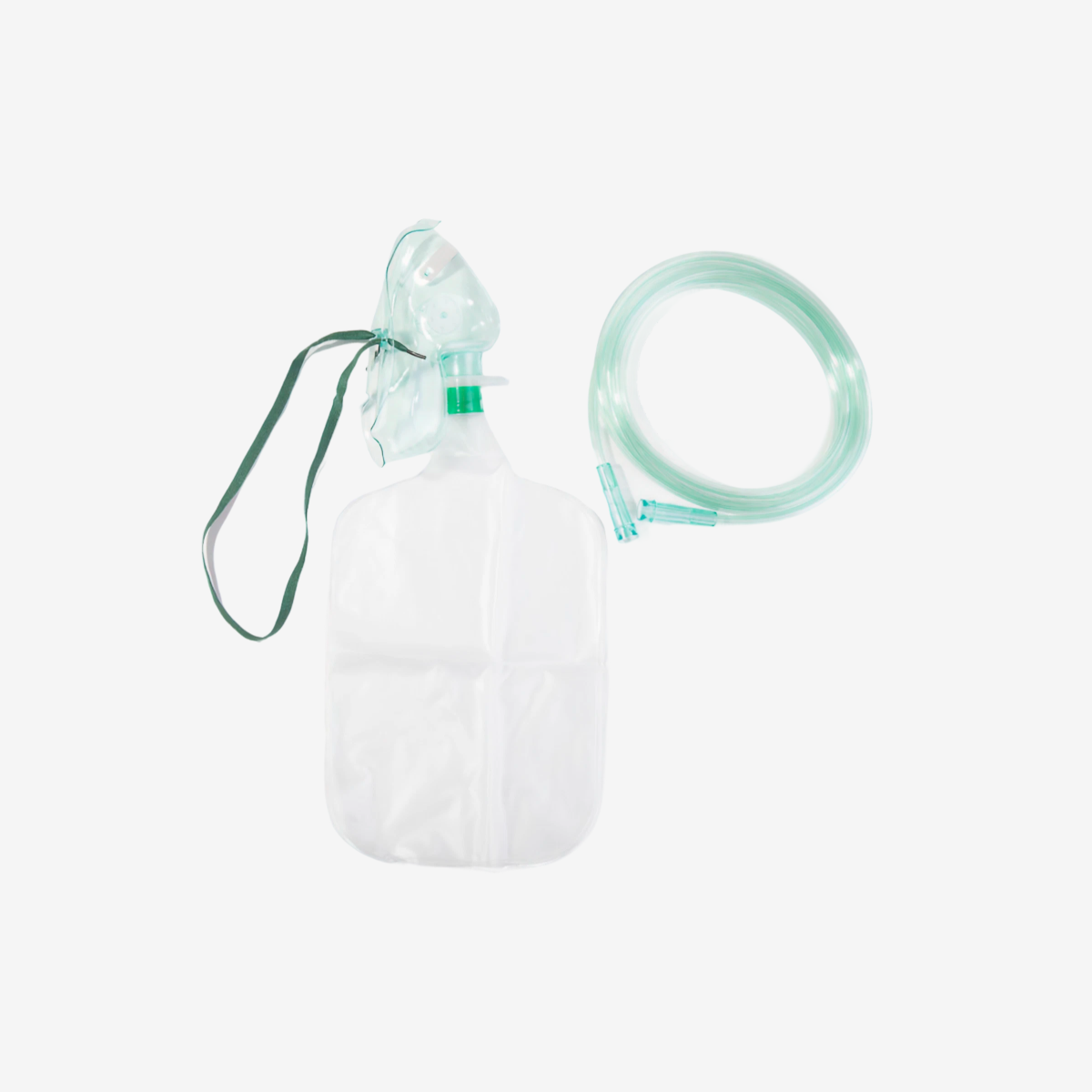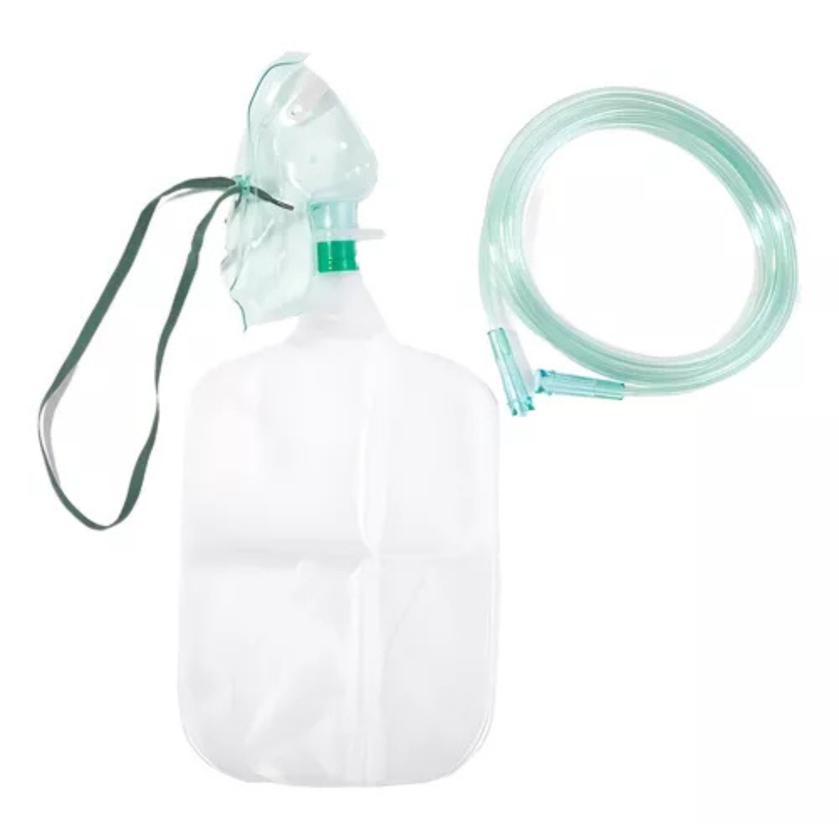 Máscara em PVC, descartável, possui balão reservatório que se conecta à rede de oxigênio. O ar expirado é direcionado para uma válvula unidirecional na máscara, permitindo a administração de altas concentrações de oxigênio.